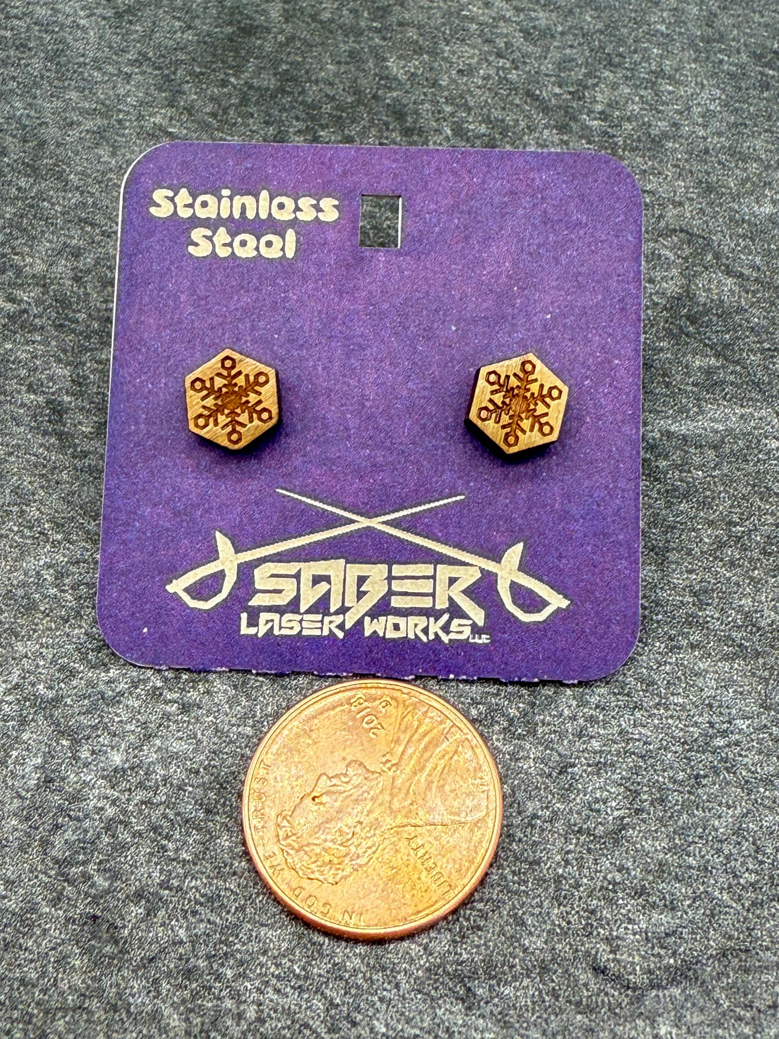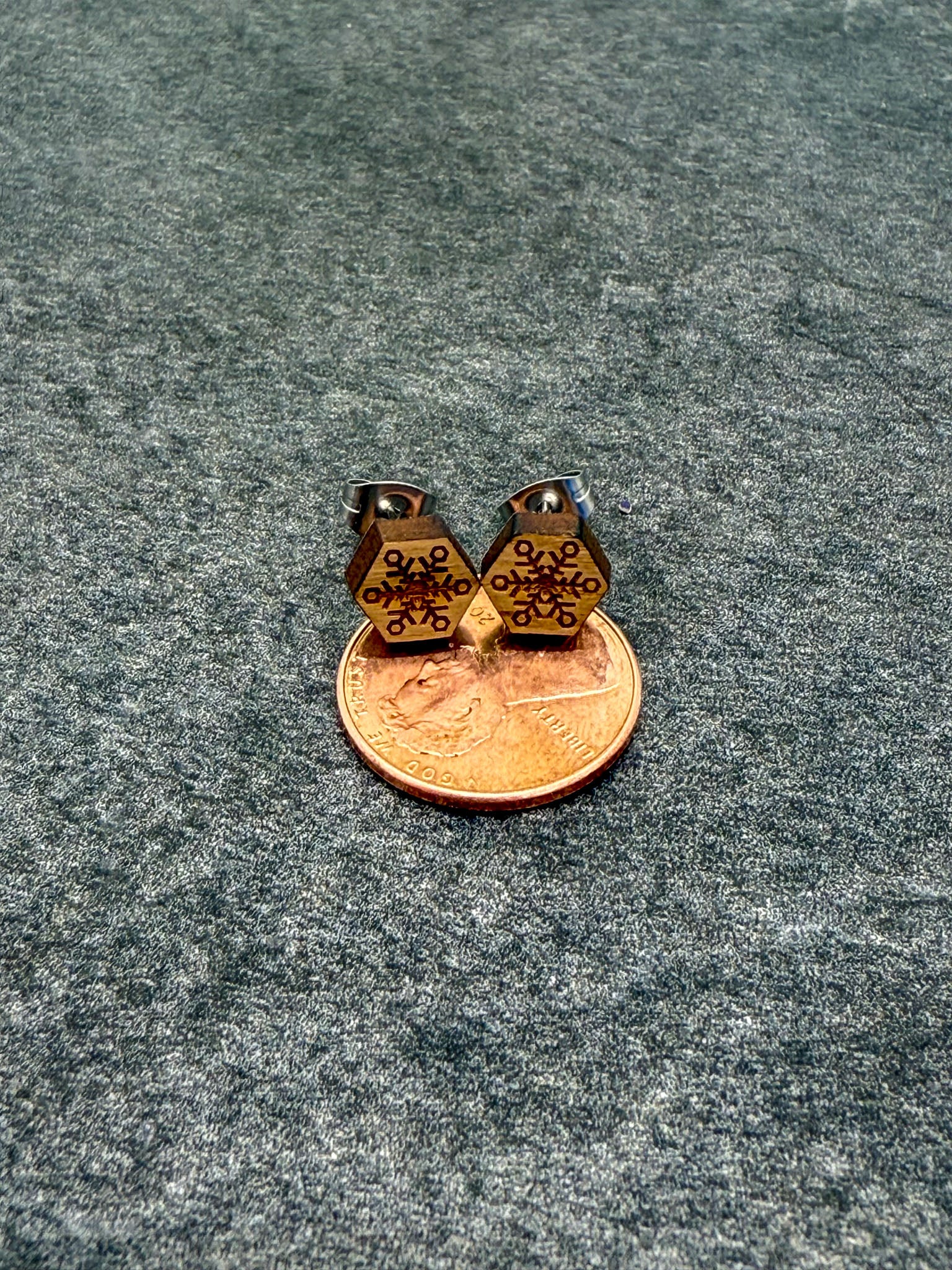 Add a pop of winter wonder to any outfit with these small hexagonal earrings! These stud earrings feature a geometric snowflake engraving, adding a unique touch to your accessory game. Perfect for showing off your love for the season in a stylish and playful way.